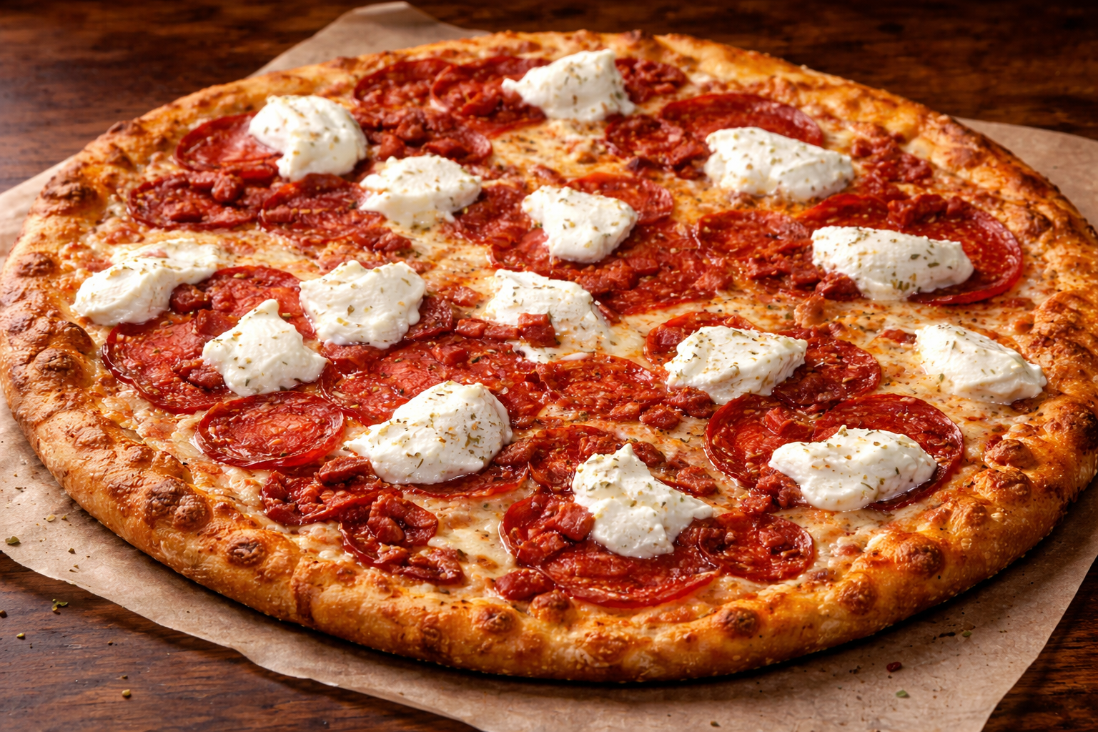 Our Pepperoni Ricotta Pizza combines the bold, savory flavor of premium pepperoni with the smooth creaminess of ricotta, layered over fresh mozzarella and house-made sauce. Baked in a traditional stone deck oven, it delivers a crispy yet chewy crust with rich, satisfying flavor in every slice.